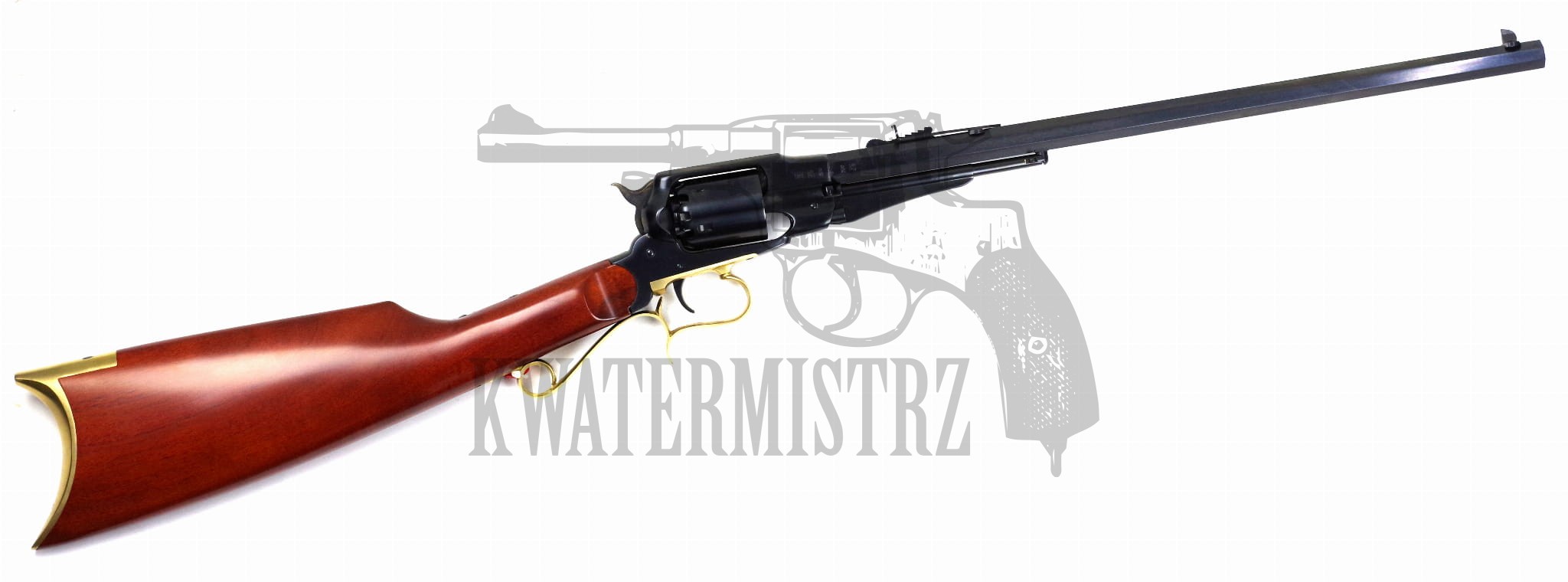 Karabin rewolwerowy Remington model 1858 Army UBERTI- klasyka od uznanego, włoskiego producenta replik broni czarnoprochowej. Jest to karabinowa wersja popularnego, sześciostrzałowego, kapiszonowego rewolweru czarnoprochowego ładowanego odprzodowo produkcji Remingtona. Pierwsza w historii tego typu konstrukcja posiadająca zamknięty szkielet. Wspomniane nowatorskie rozwiązanie zapewniało większą sztywność i niezawodność broni. Karabin wyposażony jest w regulowaną szczerbinę, pobojczyk i ma możliwość szybkiego demontażu bębna. Kolba wykonana została z drewna orzechu.