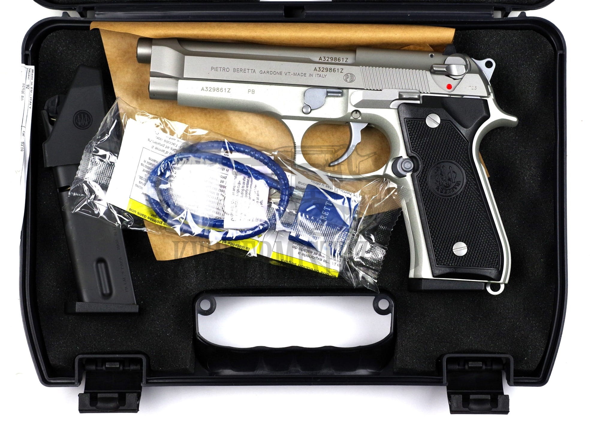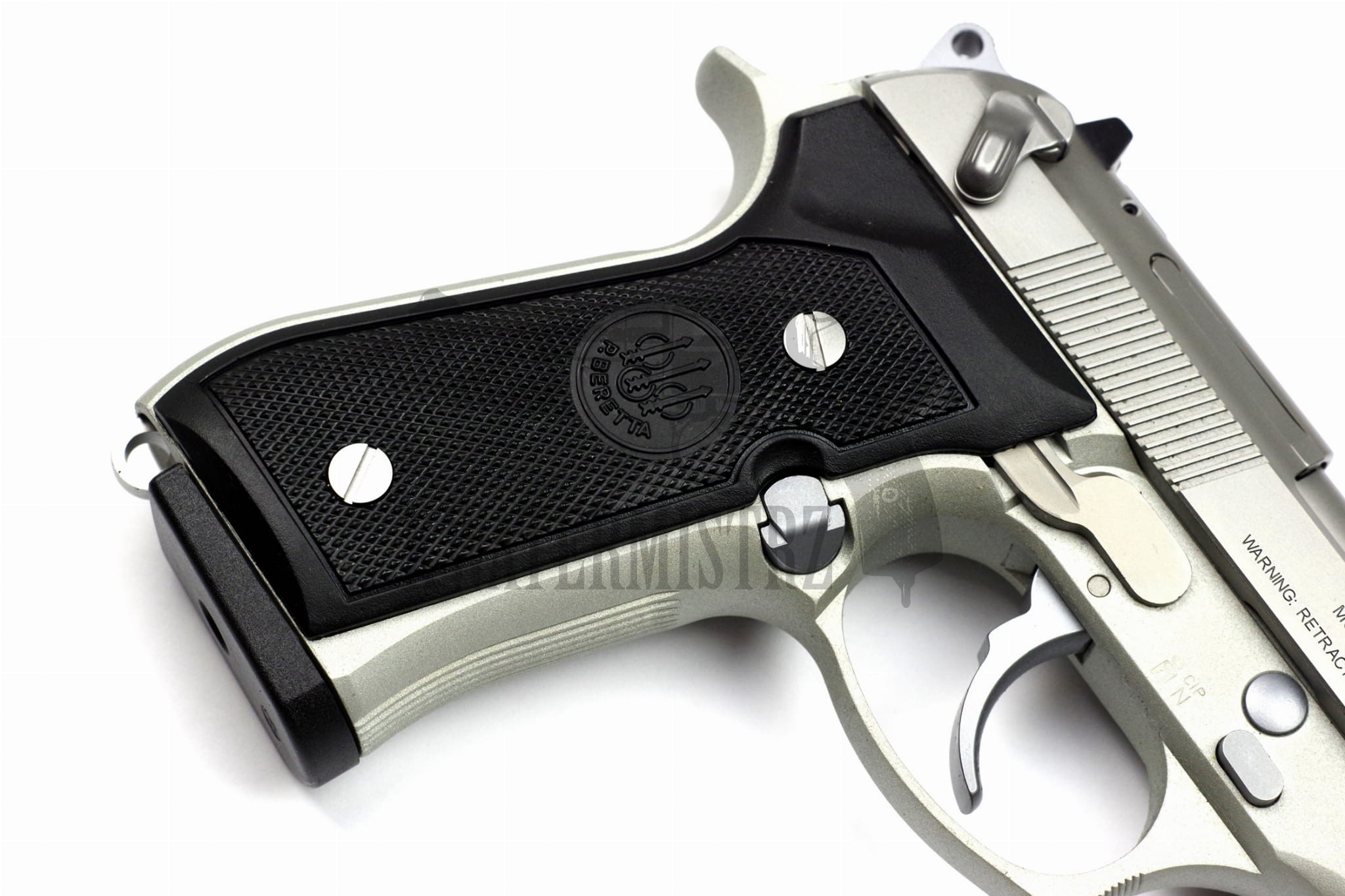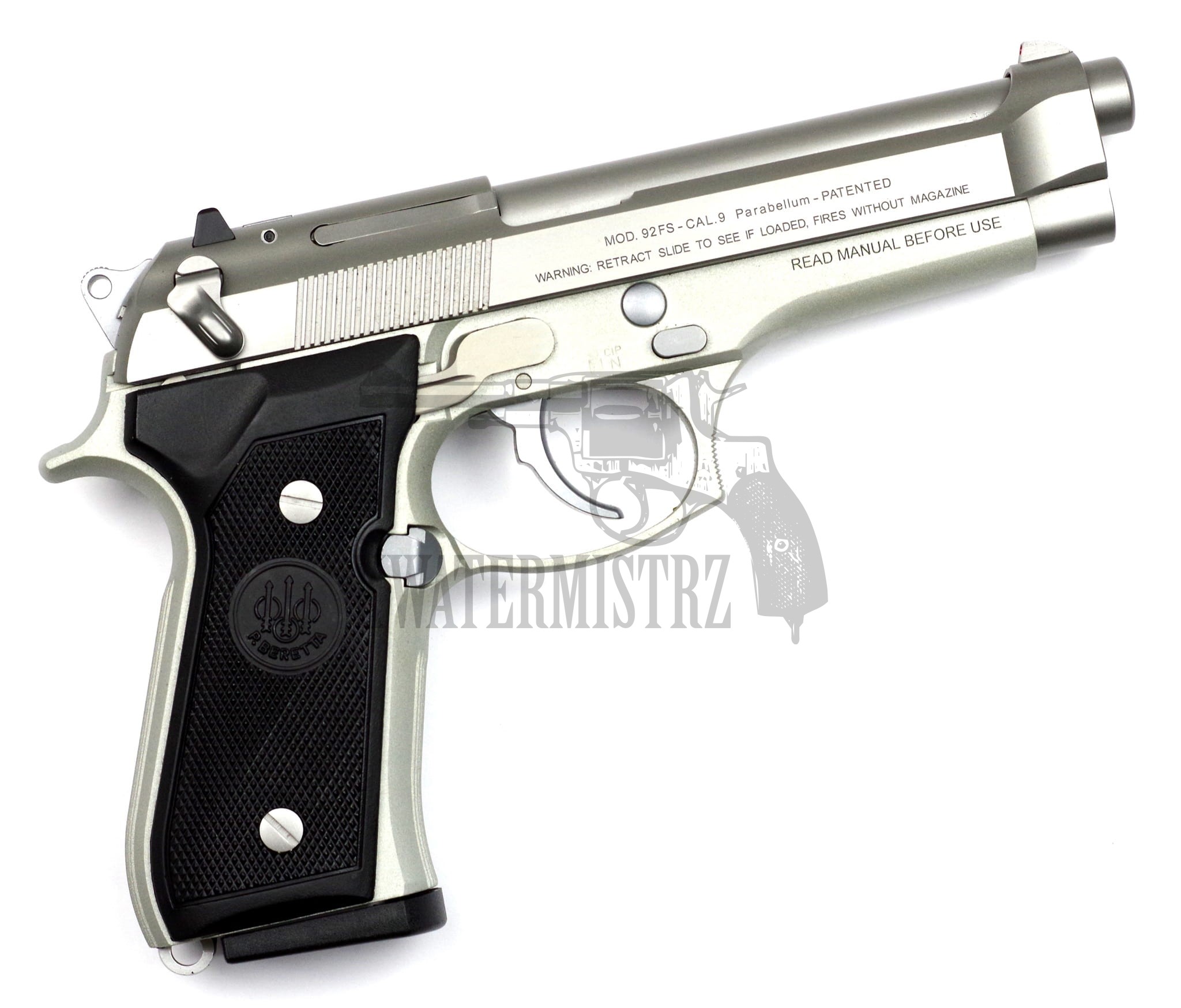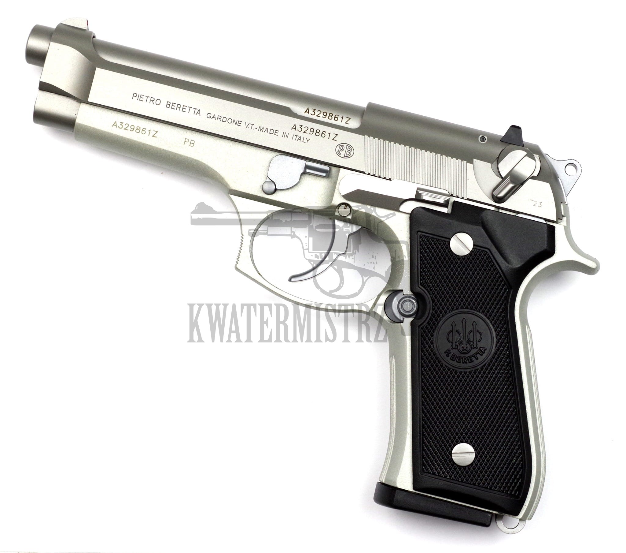 Pistolet Beretta 92FS INOX (ITALY)- absolutna klasyka krótkiej broni palnej od uznanego, włoskiego producenta broni BERETTA. Broń produkowana jest w różnych wariantach od 1976 r. do chwili obecnej. Pistolet używany na całym świecie i ceniony przede wszystkim za bezkompromisową jakość wykonania oraz niezawodność. Model FS to jedna z najpopularniejszych wersji pistoletu będąca modernizacją wersji F- broń wyposażona została w zmodyfikowaną oś kurka i prowadnice zamka. Wersja INOX wykonana została z matowej stali nierdzewnej.